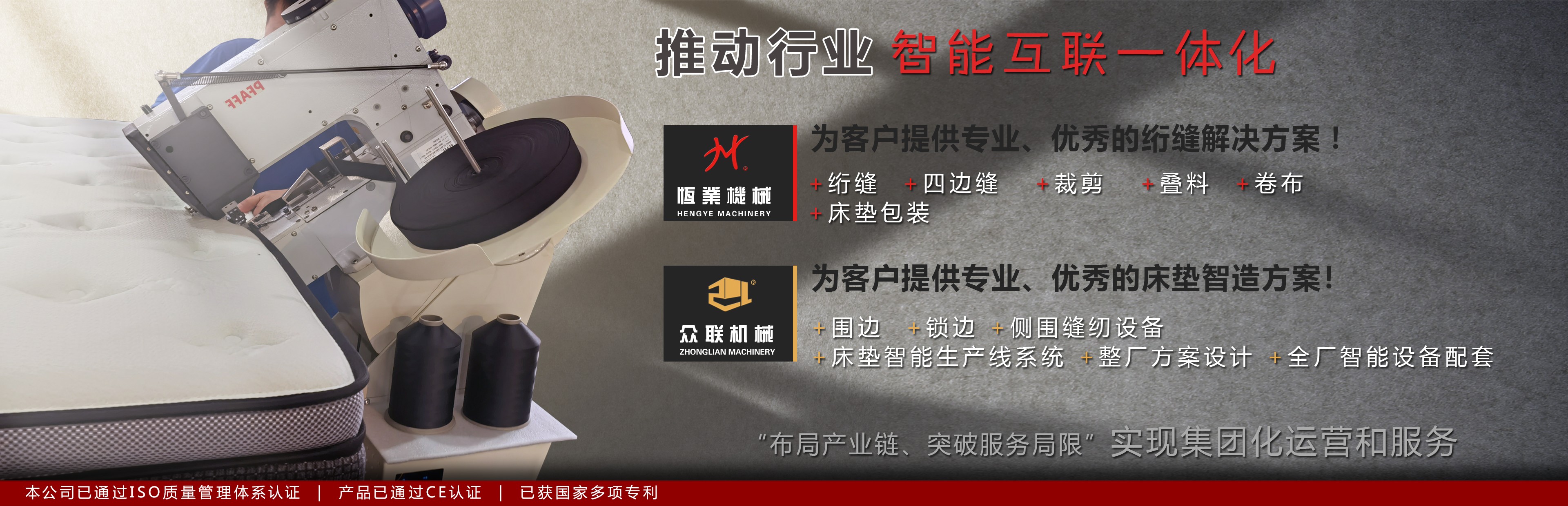 “布局產(chǎn)業(yè)鏈、突破服務(wù)局限”。聯(lián)合“佛山.眾聯(lián)機(jī)械科技”,實(shí)現(xiàn)集團(tuán)化運(yùn)營(yíng)和服務(wù),從原材料到成品床墊入庫(kù)的全套智能生產(chǎn)設(shè)備及工藝方案,我們可以提供滿格服務(wù),為客戶提供專業(yè)、優(yōu)秀的床墊智造方案。